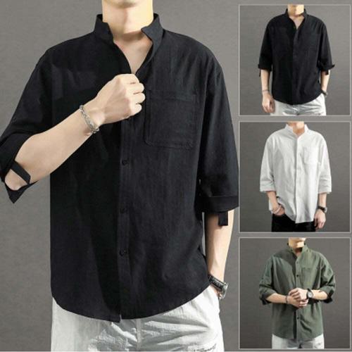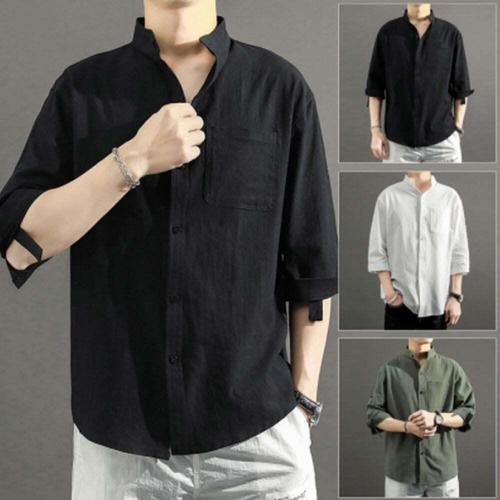 여름 스타일 스탠드 칼라 면마 중간 소매 셔츠 트렌디 남성 린넨 루즈핏 7부 소매 대형 단색 셔츠 남성 외투