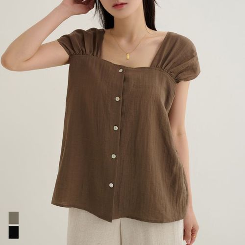 (44 77사이즈) 스퀘어넥 셔링 버튼 플레어 반팔 블라우스 (SJS26003)