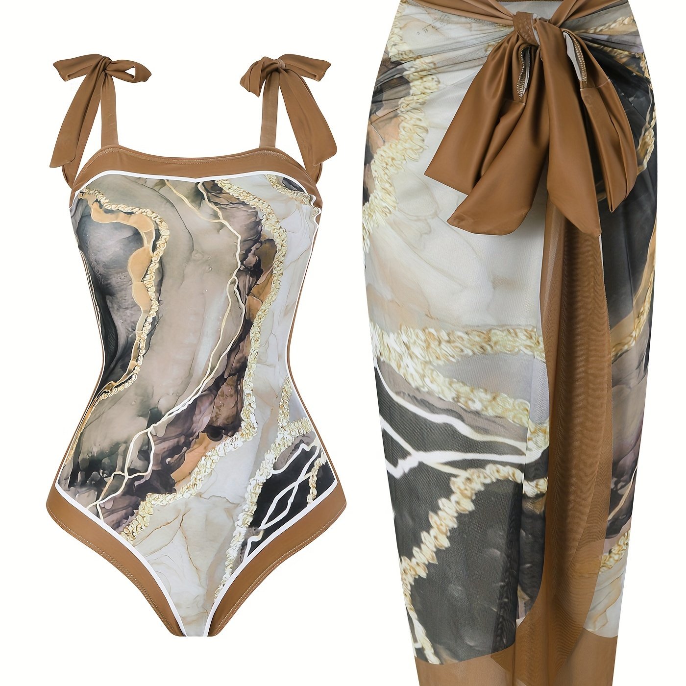 TEMU 브라운 마블 프린트 투피스 수영복, 타이 숄더 탄성 원피스 수영복 및 사라웅, 여성용 리조트 수영복 및 의류