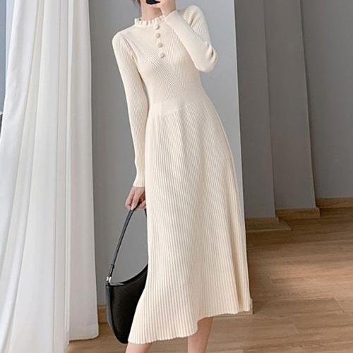 Makone 여성 가을 겨울 반폴라 캐주얼 이너 A라인 심플 니트 롱 원피스