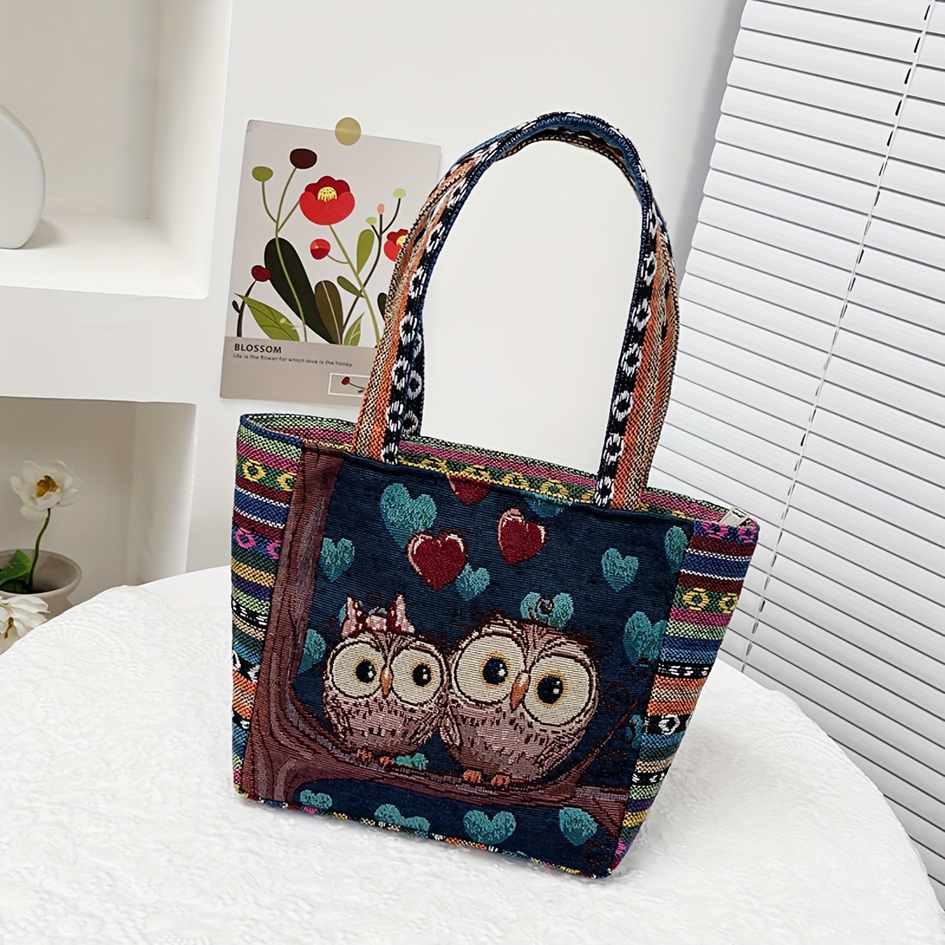 TEMU 여성용 생생한 올빼미 자수 캔버스 핸드백 - 트라이벌 패턴, 지퍼 잠금, 손세탁 가능, 런치백 & 기저귀 가방에 적합, 캐주얼 핸드백|트라이벌 스타일 가방|지퍼형 가방