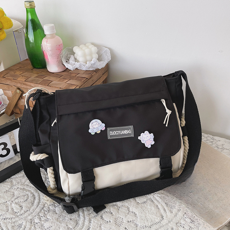 TEMU 빈티지 스타일 한국식 울장 나일론 크로스바디 백 - 대용량 투톤 파스텔 핑크 & 베이지 블랙 액센트, 귀여운 만화 패치, 조절 가능한 스트랩 & 태슬 디테일, 여성용 아카데믹 캐주얼 가방, 멀티펑셔널 퍼스, 재미있는 패치홀더 디자인
