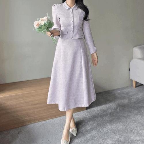 [엘린무드](세트) 마리 트위드 라운드 카라 슬림 자켓 a라인 롱 스커트 세트(2color)