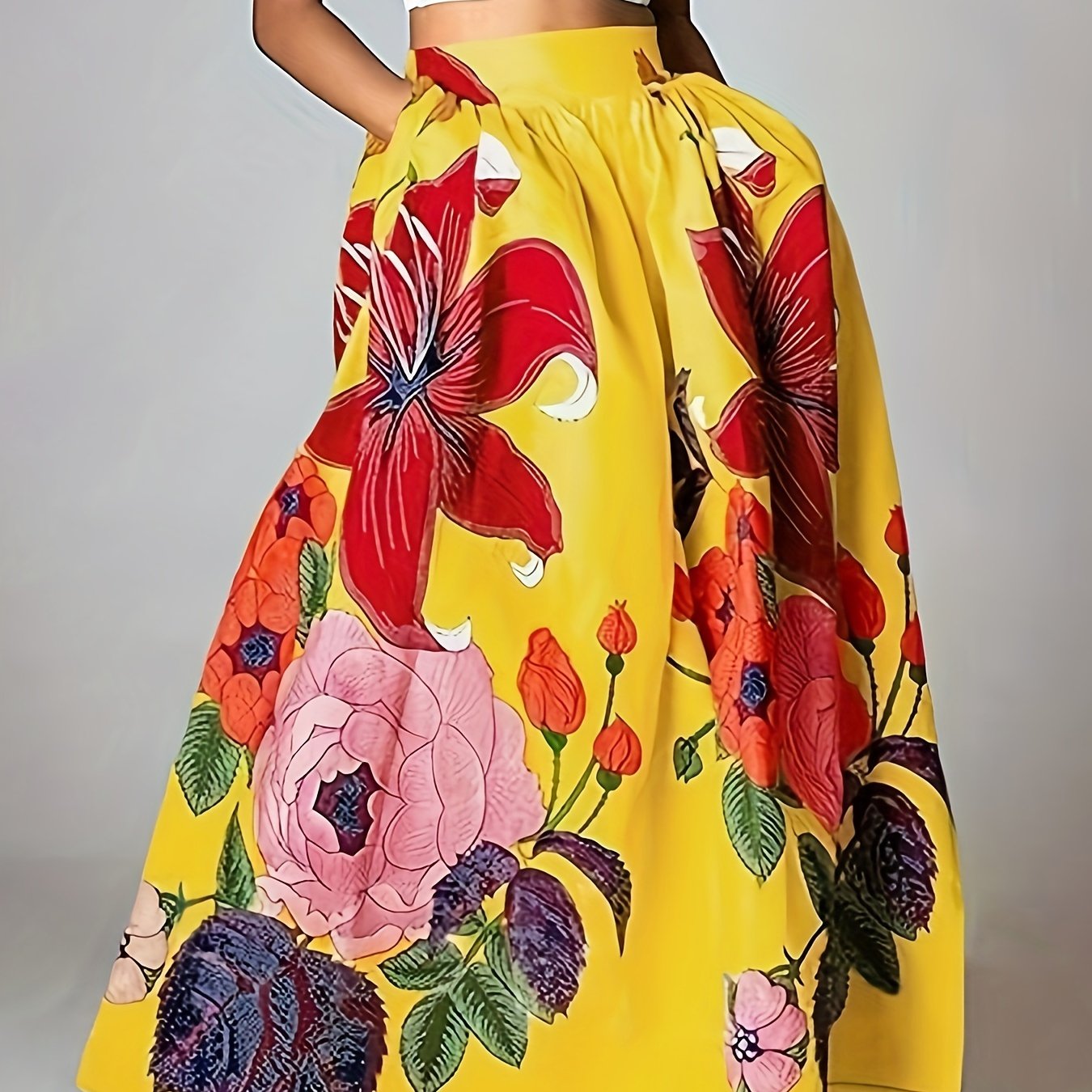 TEMU 옐로우 A라인 맥시 드레스 포켓 포함 - 하와이 히비스커스 & 버드 프린트, 반팔 러플 헴 드레스 비치 웨딩, 파티 & 휴가용 - 세탁기 사용 가능한 리조트웨어 (LF23188-1)