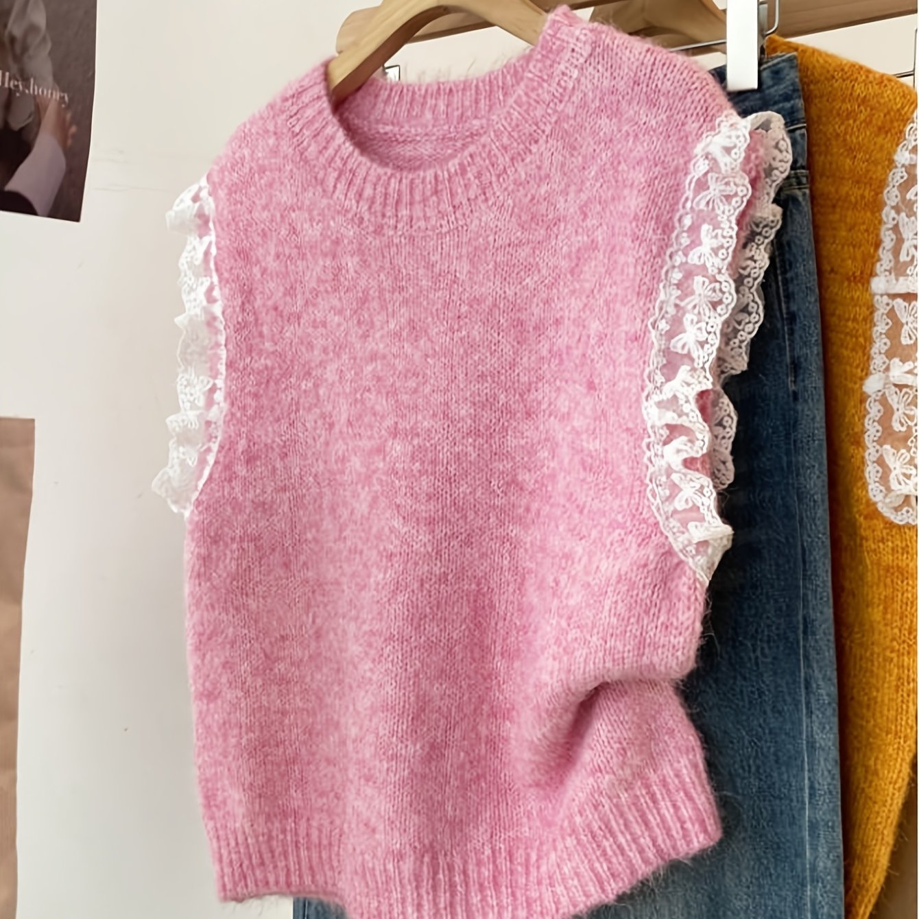 TEMU 신상 봄/여름 여성용 활용도 높은 단색 민소매 라운드넥 탱크탑, 프렌치 스타일 레이스 패치워크 장식 조끼, 핑크 여성용 겨울 스웨터 ASD1 디렉셔널