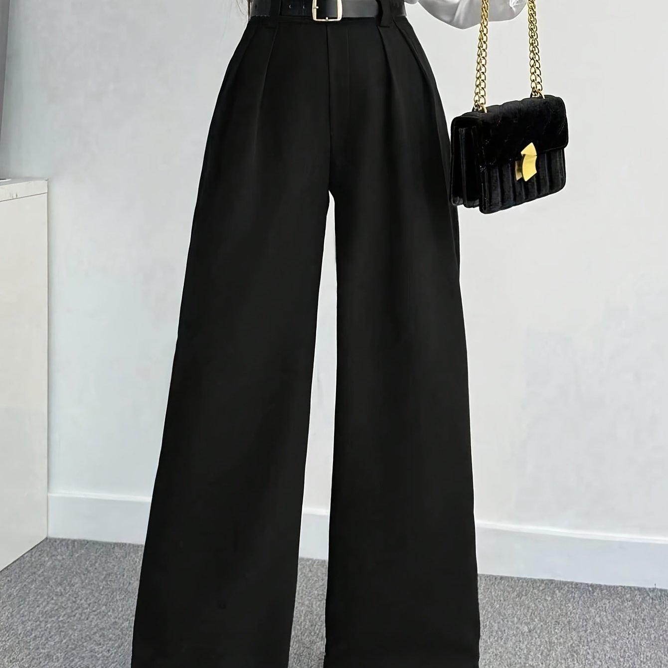 TEMU 여성 캐주얼 스타일리시 블랙 플리츠 하이웨이스트 와이드 레그 팬츠, 데일리룩에 완벽[Zllz]