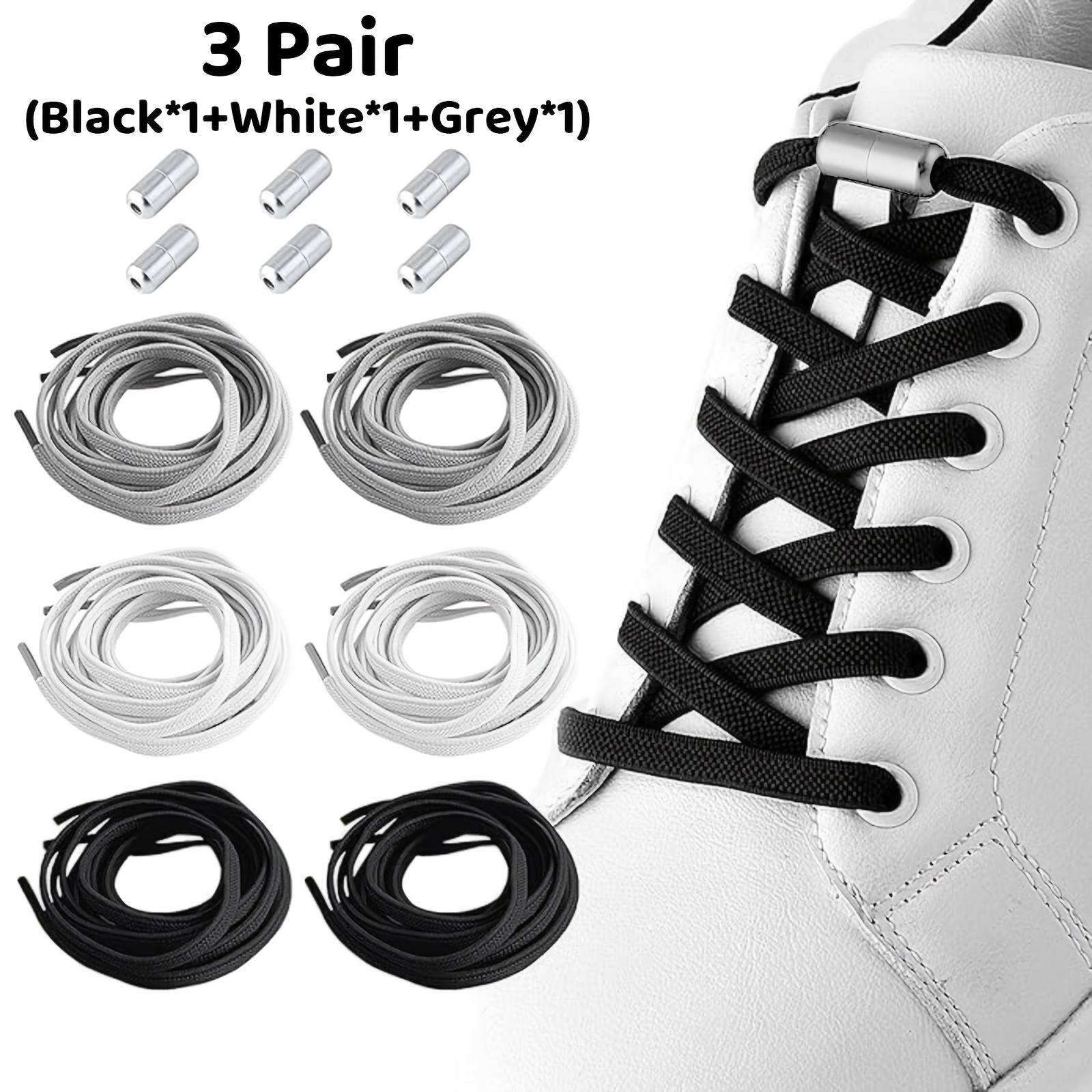 TEMU 3세트 / 총 6개 (검정색 + 흰색 + 회색) 비끈 금속 클립 탄성 신발끈, 캐주얼 경량 단색 폴리에스터, 착용하기 쉽습니다 - 0.6 X 105 Cm