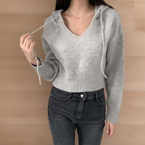 [신상오픈런]여성 브이넥 후드 긴팔 니트 시보리 숏탑