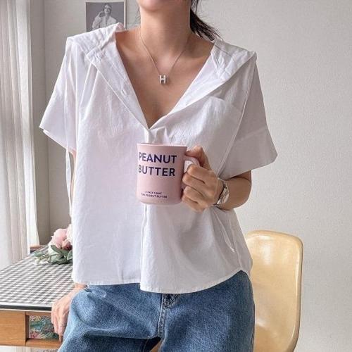 [신상오픈런]|KSH324C|여자 브이넥 페미닌 아방핏 무지 후드 반팔 셔츠_18155658_597559