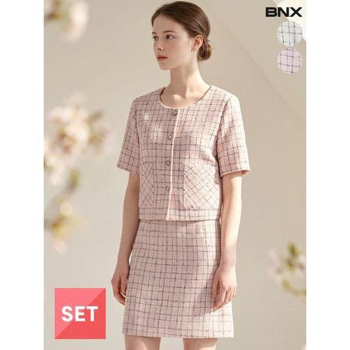 [BNX]여성 블링 큐빅버튼 반팔 트위드 스커트 셋업