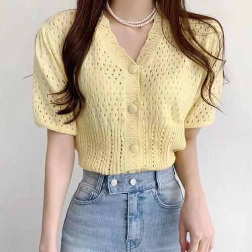 [다잇템]여자 V넥 스웨터 반소매 스모킹 단추 블라우스 (10820824A)