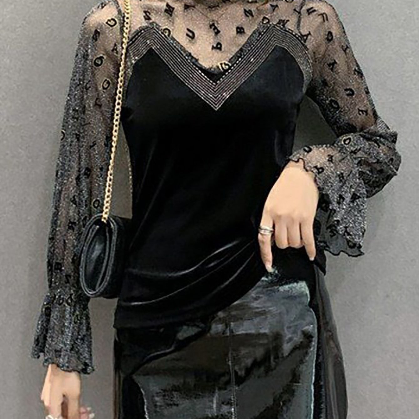 TEMU 여성 봄여름 레이스 티셔츠 빅사이즈 반목 이너 레이어드 시스루 레터링 프린트 긴팔 티셔츠 펀칭 티셔츠 나팔 소매