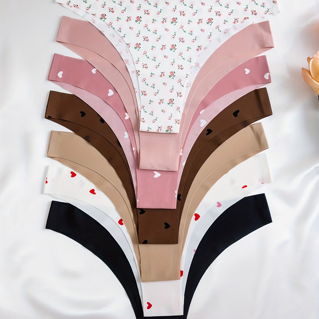 TEMU 여성용 팬티 7팩, 멀티컬러 무봉제 로우라이즈 플로럴 하트 비키니 끈팬티 세트