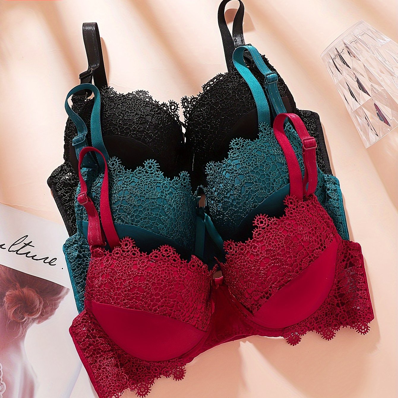 TEMU 여성용 단색 브라 3종 세트, B컵, 편안한 란제리