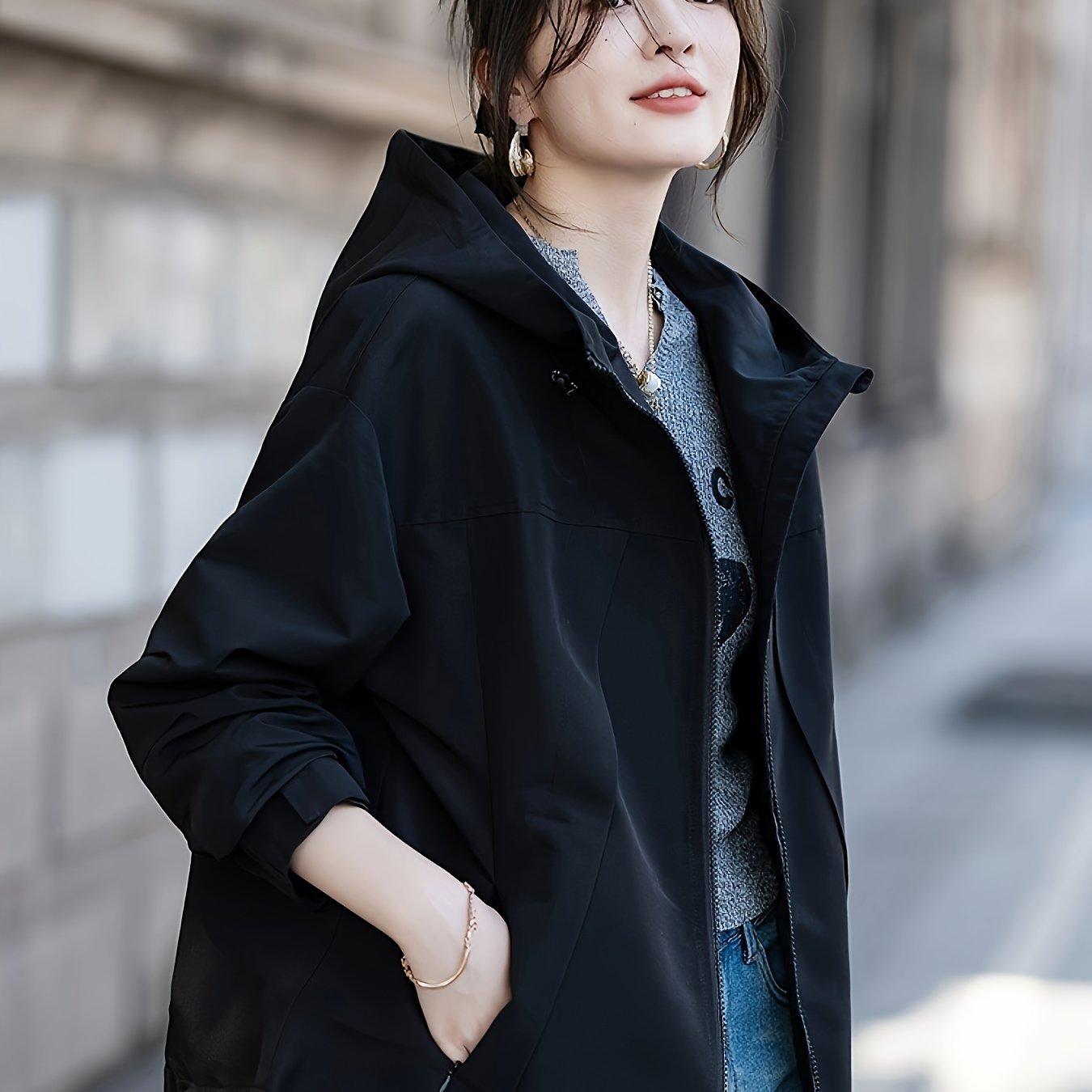 TEMU 플러스 사이즈 - 여성 캐주얼 후드 재킷 - 블랙, 지퍼업, 긴 소매, 스트레치되지 않은 원단, 조절 가능한 드로스트링 후드가 있는 봄/가을 아우터웨어, 캐주얼 아웃도어 웨어 | 스타일 | 지퍼 재킷