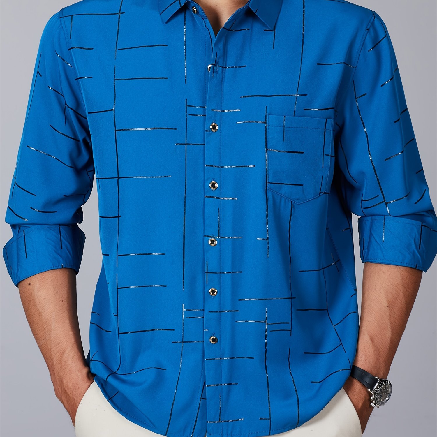 TEMU 남성용 캐주얼 긴팔 셔츠, 기하학 패턴 | 봄/가을 시즌, 신축성 없는 원단, 싱글 브레스트 플라켓, 라펠 칼라