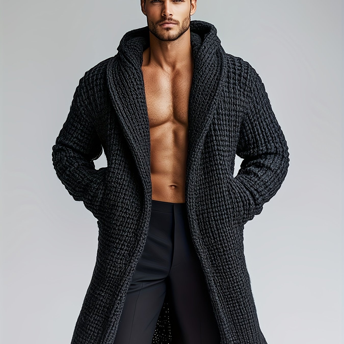 TEMU 플러스 사이즈 남성용 니트 가디건, 두꺼운 털실 직조 기술로 제작된 긴 후드 니트 코트, 양쪽에 큰 포켓이 특징입니다. 전체적인 핏은 넉넉하고 스타일리시하며 따뜻함과 패션을 결합하여 캐주얼하면서도 세련된 스타일을 연출할 수 있습니다.|가디건|빅사이즈