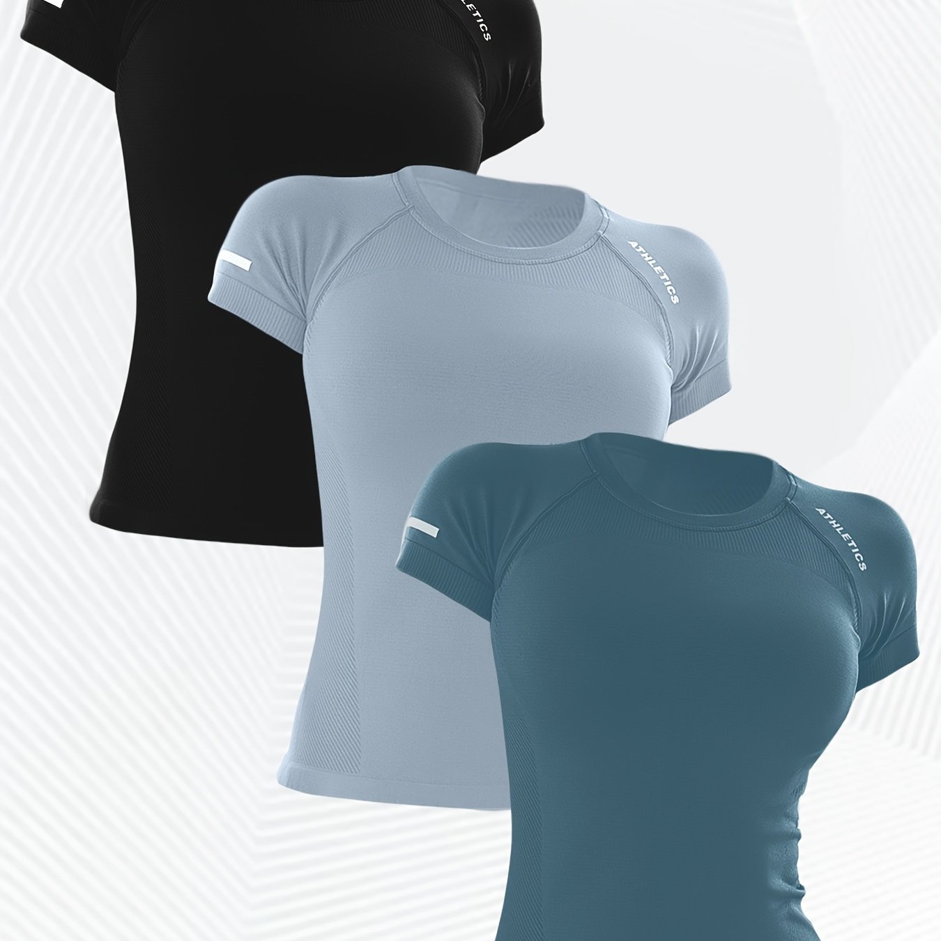TEMU 3개 여성용 운동용 티셔츠 - 고신축성, 통기성 나일론 반팔 요가 & 피트니스 탑, 블랙, 그레이, 틸 색상 레터 디자인|요가|반팔티|반팔티셔츠