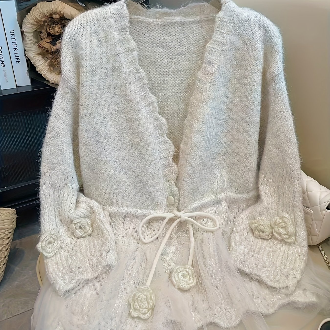 TEMU 정교하고 놀라운 메쉬 패치 여성용 가디건, 한국 스타일의 부드럽고 우아한 나이 감추는 루즈핏 스웨터 아우터웨어 상의