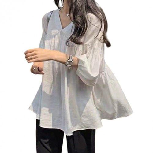 [오너클랜]인기상품 여성용 브이넥 퍼프 7부 반팔 오버핏 롱 셔츠 [WFLKRFE_260303]