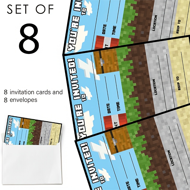 TEMU 8 픽셀 게임 초대 카드 생일 파티 용품, 소형 선물, 게임 인사 카드, 고급 손글씨 초대 카드, 파티 초대 카드 - 패션과 완벽한 할로윈 선물