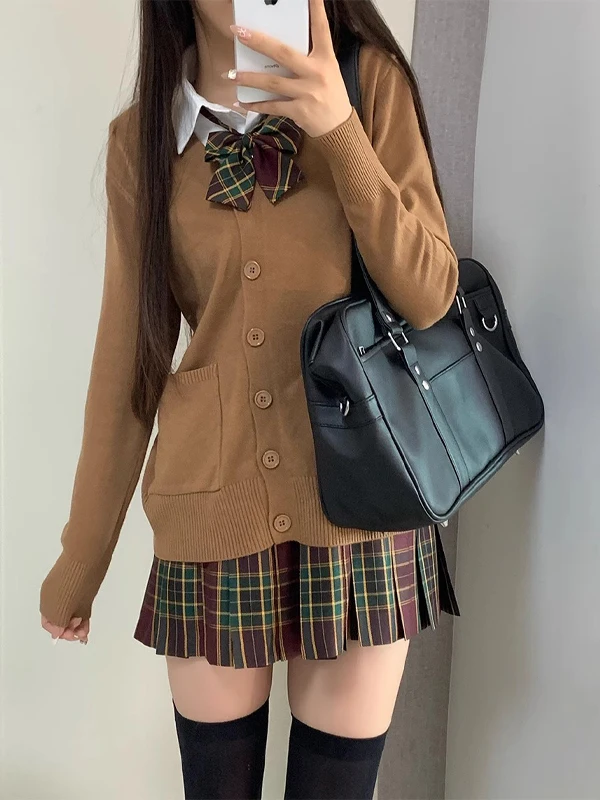 오리지널 JK 긴팔 니트 가디건 유니폼 세트 대학 스타일 가을 겨울 브라운 여성 패션 앙상블 폴로 칼라 버튼업