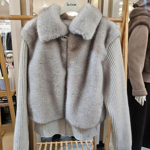 Latium HC06 짧은 니트배색 페이크퍼 밍크 집업 카라 쟈켓 T2543jk06B