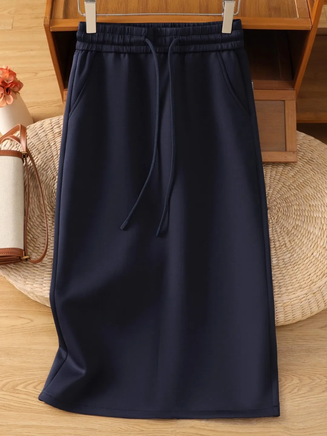 다크 블루 A라인 미디 스커트 하이웨이스트 캐주얼 여성용 봄 가을 패셔너블 스포츠 스커트 출퇴근용 스트레이트 튜브 스커트