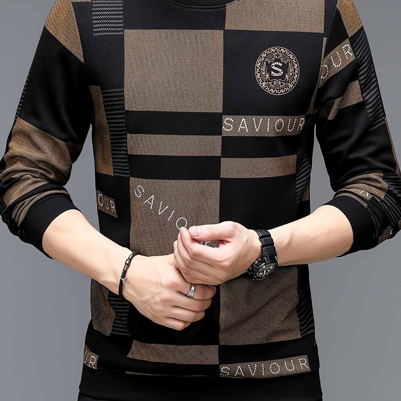 TEMU 남성용 긴팔 크루넥 스웨트셔츠 - 블랙, 캐주얼 및 홈웨어에 적합한 소프트 풀오버 셔츠, 기계 세탁 가능 일상 필수 아이템, 릴렉스드 스타일, 지오메트릭 패턴, 편안한 소재, 스타일리시 의류, 어반 룩