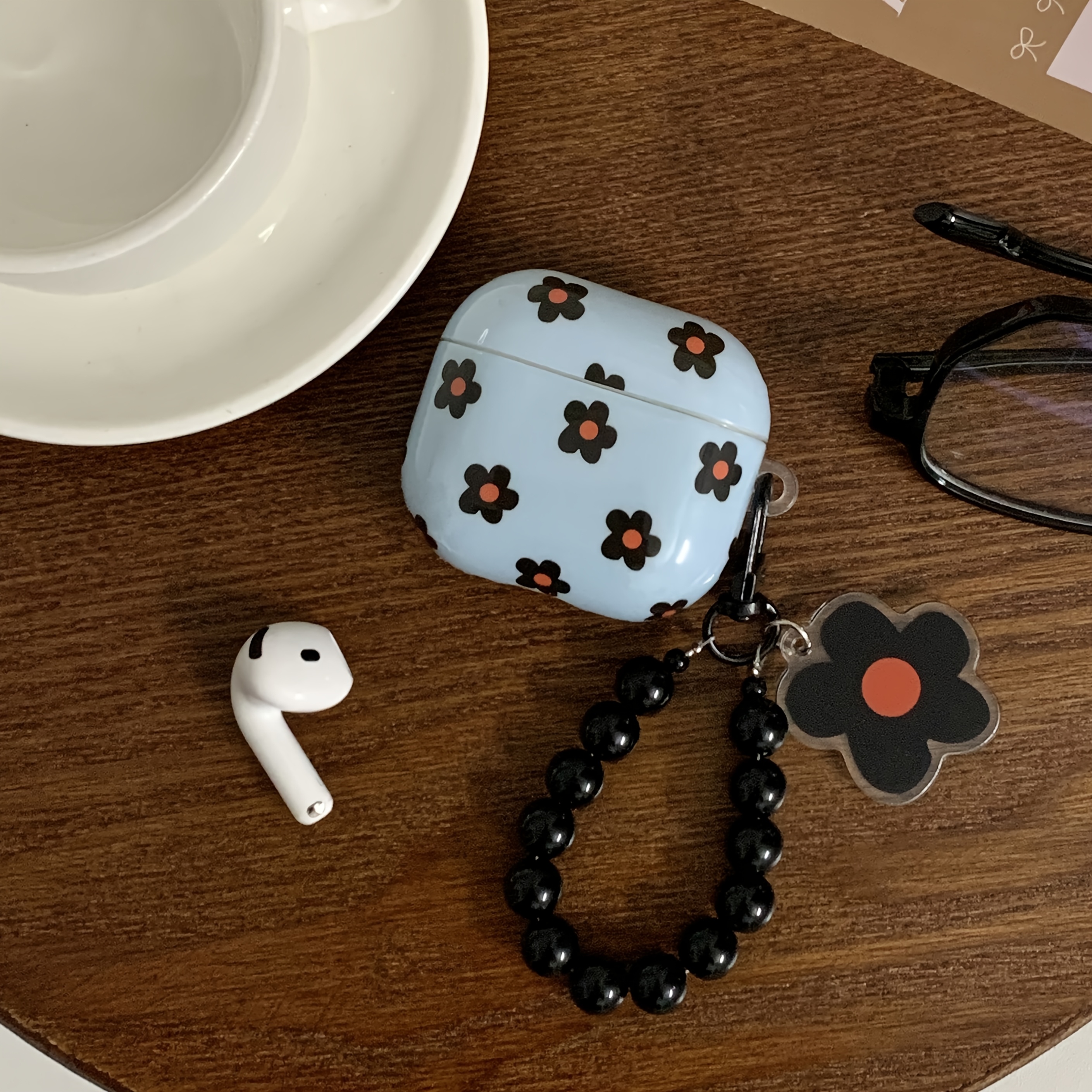TEMU 한국 스타일 블루 배경 소형 검은 꽃 + 펜던트 헤드폰 케이스 애플용으로 적합한 에어팟 프로 2 케이스/에어팟 프로 케이스/에어팟 4 케이스/에어팟 3 케이스/에어팟 2 케이스/패션 여성용 이어폰 케이스/간단한 이어폰 케이스