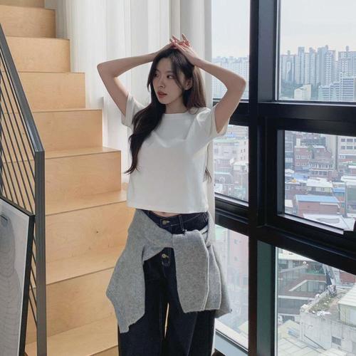 [에이치플러스몰]여자 기본 면티 크롭 반팔 티셔츠 U넥 스판 실켓 무지 5부 반팔티