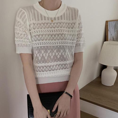 [다잇템]여성 모양 U넥 반팔 펀칭 베이직 니트