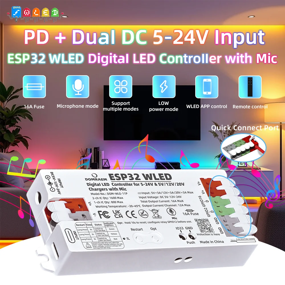 DOMRAEM PD ESP32 WLED 디지털 LED 컨트롤러 마이크로폰 내장 듀얼 전원 입력 USB-C PD& DC5-24V WS281x APA102 SK6812 등용