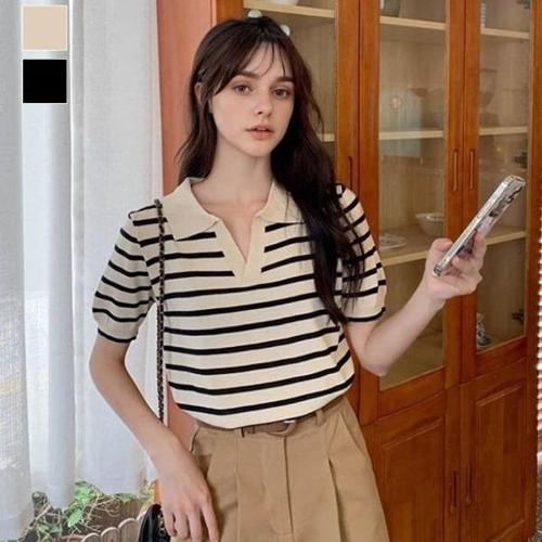 [엄지척]스트라이프 카라 오픈형 브이넥 허리밑밴딩 반팔티_19610343_667501