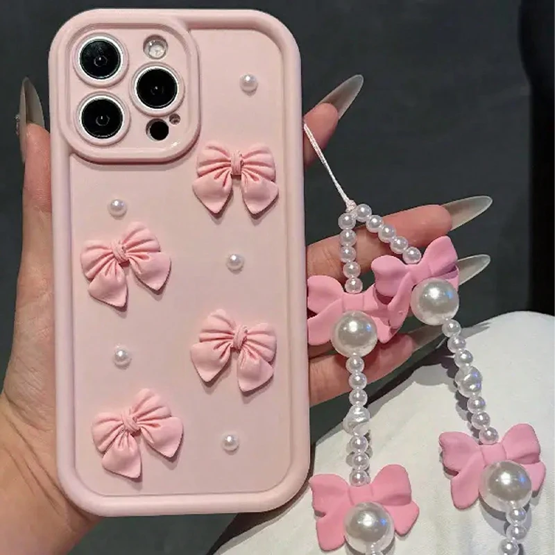 아이폰 16 17 Pro 15 14 13 12 11 Pro Max 16E 7 8 Plus용 한국 3D 나비 리본 진주 실리콘 폰 케이스 (끈 포함 소프트 커버)